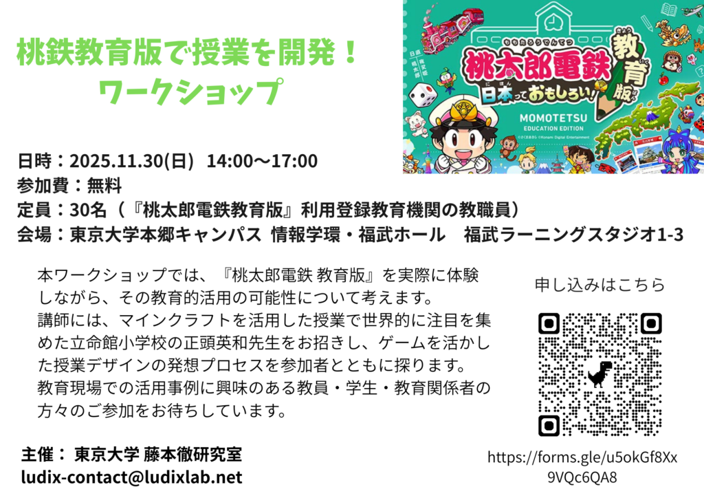 本ワークショップでは、『桃太郎電鉄 教育版』を実際に体験しながら、その教育的活用の可能性について考えます。講師には、マインクラフトを活用した授業で世界的に注目を集めた立命館小学校の正頭英和先生をお招きし、ゲームを活かした授業デザインの発想プロセスを参加者とともに探ります。教育現場での活用事例に興味のある教員・学生・教育関係者の方々のご参加をお待ちしています。