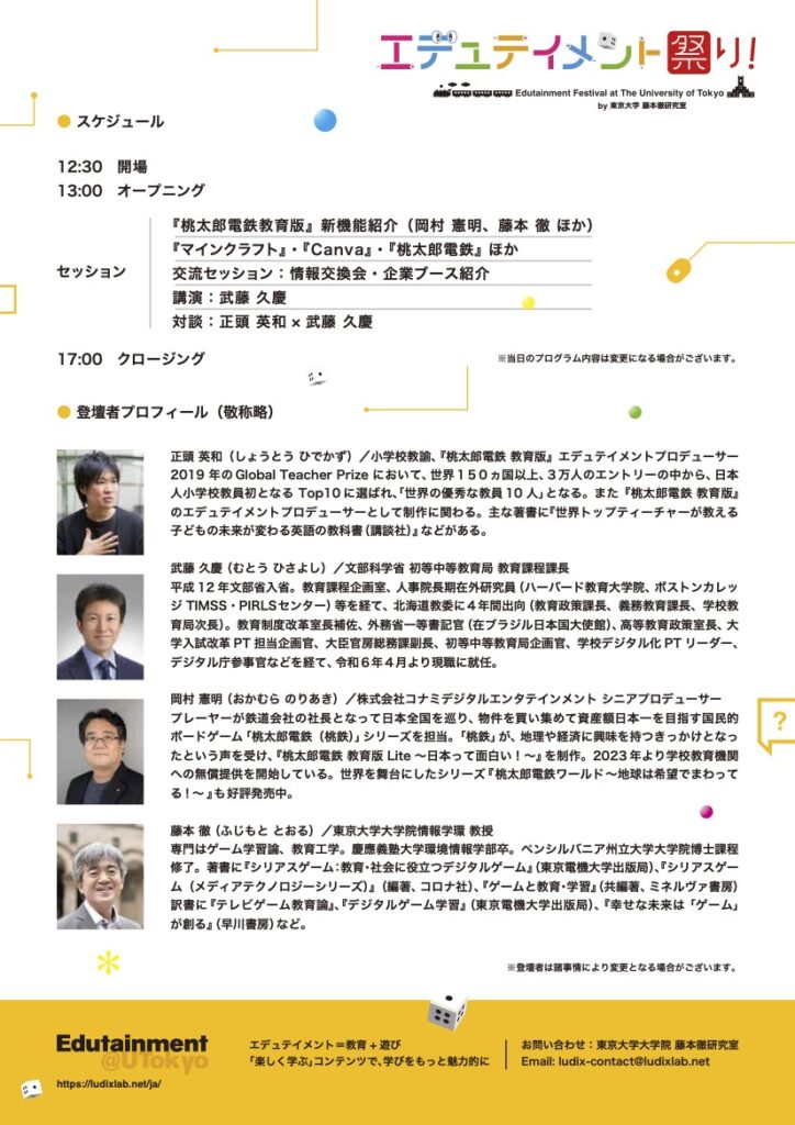 前回の反響を受け、今年も『エデュテイメント祭り!』を東京大学本郷キャンパスにて開催いたします。文部科学省の武藤久慶氏とエデュテイメントプロデューサーの正頭英和氏による講演&対談セッションのほか、『桃太郎電鉄教育版』の最新機能紹介と実践報告セッション、教育版マインクラフトの体験セッション、企業各社によるエデュテイメント関連製品やサービスの展示などを行います。このテーマに関心のある方はどなたでもご参加いただけます。