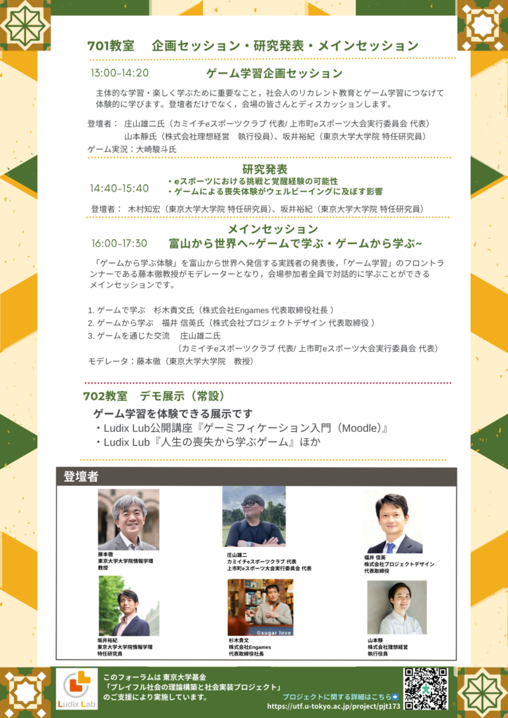 ゲームは、娯楽としてだけでなく、学びの可能性を大きく広げる力を持っています。本フォーラムでは、ゲーム活用の最前線で活動する研究者や実践者が集まり、その事例や未来の展望をわかりやすく紹介します。教育現場で新しいアプローチを探している教員の方、教育事業に携わる方、そしてゲームと学びの関係に興味を持つ学生や一般の方まで、どなたでもご参加いただけます。